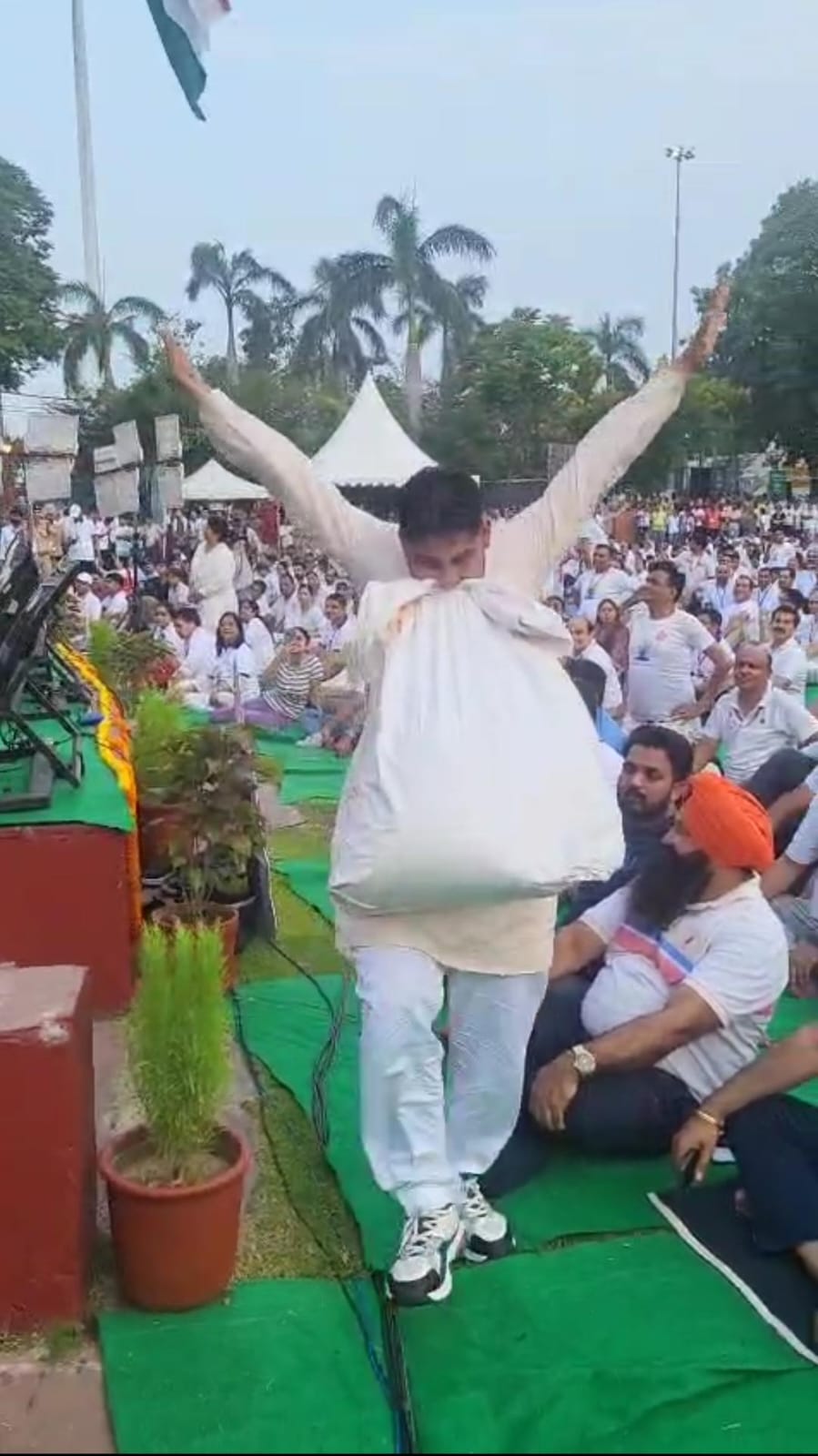 पिपली 22 जून : शनिवार को आयोजित राजकीय योग दिवस के अवसर पर बारना गांव के एक युवक रवि बारना ने 50 किलों का सीमेंट का कट्टा दांतों में फंसा कर हजारो लोगो के सामने उठा कर प्रदर्शन किया। स्वामी रामदेव ने बताया कि रवि के दांत बहुत मजबूत है रवि ने पहले भी अपने दांतों से कई बार वजन उठाया है। रवि ने पत्रकारों से बात करते हुए कहा बाबा रामदेव एवं आचार्य बाल कृष्ण की प्रेरणा से वो यह काम करने में समर्थ हुए है | उन्होंने कहा की आज योग दिवस के अवसर पर उन्हें बाबा के प्रयासों से आज इतने बड़े मंच पर बड़े लेवल पर उनको शक्ति प्रदर्शन करने के लिए आशीर्वाद दिया। रवि ने कहा कि वह बहुत समय से योग करता आ रहा है और इससे मानसिक और शारीरिक बल मिलता है और 50 किलों का वजन उठाना उसके मजबूत दांतों के लिए मामूली सी बात है और ये कमाल योग के साथ साथ खानपान को जाता है। रवि ने बताया की वो अपने खेतों में प्राकृतिक खेती करता है और उसी के उत्पाद अपने घर में प्रयोग करता है और देसी संस्कृति को मानता है। रवि ने बताया की वो खुद आयुर्वेदिक वस्तुओं का उपयोग करता है और आमजन को भी प्रेरित करते है की स्वदेशी का इस्तमाल करे। योग मंच से बाबा रामदेव ने रवि के दांतों की मजबूती का मुख्य कारण भी यही बताया की योग से शारीरिक मजबूती मिलती है | स्वामी रामदेव ने बताया की रवि पतंजलि से वर्षों से जुड़ा हैं और आज के आयोजन के लिए रवि ने घर घर जाकर प्रचार किया और जो भी ड्यूटी लगाई जाती है उसको दिल से करने का मौका नहीं चूकते। कार्यक्रम में पूर्व मंत्री सुभाष सुधा समेत सभी गणमान्य लोगों ने रवि की भुरी भूरी प्रशंसा की और उसके इस कार्य पर हैरानी भी जताई और आशीर्वाद दिया इस अवसर पर डॉ. प्रवीण शर्मा प्रिंसिपल का भी आभार जताया जिनकी लगातार प्रेरणा से आज का ये कार्य सफल हुआ।