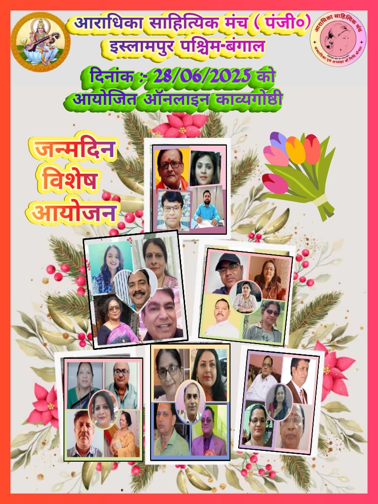 आराधिका साहित्यिक मंच (पंजी.) पर मंच महासचिव सुधीर श्रीवास्तव (यमराज मित्र) 01जुलाई, वरिष्ठ कवि प्रेम प्रकाश श्रीवास्तव ‘प्रणय’ ( संस्थापक प्रणय साहित्यिक दर्पण) 02 जुलाई एवं वरिष्ठ कवयित्री डा. आभा गुप्ता 01 जुलाई के जन्म दिन के उपलक्ष्य मंच की 41वीं भव्य आभासी काव्य गोष्ठी का 28 जून’ 2025 को अग्रिम आयोजन किया गया। गोष्ठी सायं 4:00 बजे से रात्रि लगभग 7.30 बजे तक निरंतर गतिमान रहकर भव्यता के साथ संपन्न हुई।