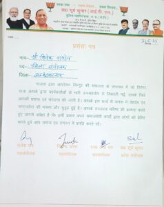 अम्बेडकरनगर ।भाजपा द्वारा ऑपरेशन सिंदूर की सफलता के उपलक्ष में जो तिरंगा यात्रा आपके द्वारा कार्यकर्ताओं के भारी जनसहयोग से निकाली गई उसके लिए आप की प्रशंसा एवं सराहना की जाती है व अंतरराष्ट्रीय योग दिवस, अंतिम पायदान पर खड़े व्यक्ति को सरकार की योजनाओं से लाभान्वित कराने समाज में सुशासन स्थापित करने व कुशासन दूर कराने में सहयोग आपके इस कार्य से जनता में देश प्रेम एवं समाज सेवा की भावना और सुदृढ़ हुई है