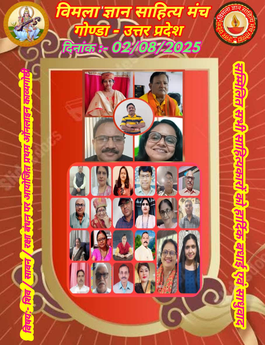 माता-पिता/ सास-ससुर की स्मृतियों को जीवंत रखने के उद्देश्य से अंजू श्रीवास्तव/ सुधीर श्रीवास्तव द्वारा स्थापित ‘विमला ज्ञान साहित्य मंच’ की प्रथम आभासी काव्य गोष्ठी का ‘शिव/सावन/रक्षाबंधन’ विषयक आयोजन 02जुलाई’2025 को किया गया। गोष्ठी शाम 5:00 बजे से रात्रि लगभग 08: 30 बजे तक निरंतर गतिमान रहकर भव्यता के साथ संपन्न हुई।