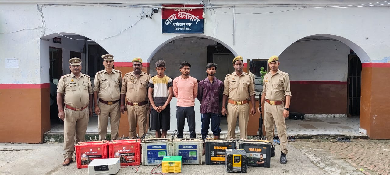 अम्बेडकर नगर ।पुलिस अधीक्षक केशव कुमार के निर्देशन में अपराध की रोकथाम व अपराधियों के ऊपर प्रभावी अंकुश लगाने हेतु चलाये जा रहे अभियान एवं क्षेत्राधिकारी नगर नितीश तिवारी के पर्यवेक्षण में थाना बसखारी पुलिस टीम द्वारा दिनांक 09.08.2025 को थाना स्थानीय पर पंजीकृत मु0अ0सं0 233/2025 धारा-305(5)/331(4) बीएनएस से सम्बन्धित अजय कुमार पुत्र रामचन्दर निवासी अशरफपुर थाना टाण्डा जनपद अम्बेडकरनगर ,तुषार गौड़ पुत्र रामनेवाज गौड़ निवासी अमिया बाभनपुर थाना बसखारी जनपद अम्बेडकरनगर ,अंश यादव पुत्र सुरेश यादव निवासी कटुईया केशवपुर थाना सम्मनपुर जनपद अम्बेडकरनगर को मुखबिर खास की सूचना पर सुबह करीब 01.30 बजे बुढ़नापुर तिराहे से गिरफ्तार किया गया।गिरफ्तार अभियुक्त कि निशानदेही पर 06 अदद बैटरा व 03 अदद इन्वर्टर बरामद किये गये ।बाद विधिक कार्यवाही अभियुक्तों को न्यायालय के समक्ष प्रस्तुत कर जेल गया। उल्लेखनीय है कि अभियुक्त उपरोक्त द्वारा थाना क्षेत्र बसखारी, थाना क्षेत्र जलालपुर व थाना क्षेत्र सम्मनपुर से सरकारी पंचायत भवन के अंदर ताला तोड़कर इनवर्टर और बैटरी चोरी करने की घटना कारित की गई । इनके द्वारा रुद्रपुर भगाई व जीवट नर्सरी थाना जलालपुर के पंचायत भवन से चोरी करने की घटना भी प्रमाणित हुई है  गिरफ्तार करने वाली पुलिस टीम में उ0नि0 प्रेमबहादुर यादव, उ0नि0 विनय कुमार सिंह,का0 राजेश पाल,का0 ललित सरोज,का0 सौरभ यादव थाना बसखारी जनपद अम्बेडकरनगर रहे।