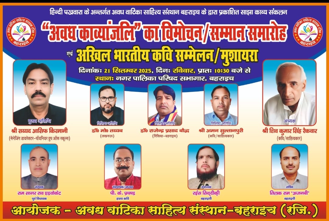 बहराइच: हिंदी पखवाड़ा के अंतर्गत अवध वाटिका साहित्य संस्थान (रजिस्टर्ड), बहराइच द्वारा प्रकाशित अवध काव्यांजलि के रस्म-ए-इजरा (विमोचन), सम्मान समारोह, कवि सम्मेलन और मुशायरा 21 सितंबर 2025 को सुबह 11 बजे आयोजित किया जाएगा।