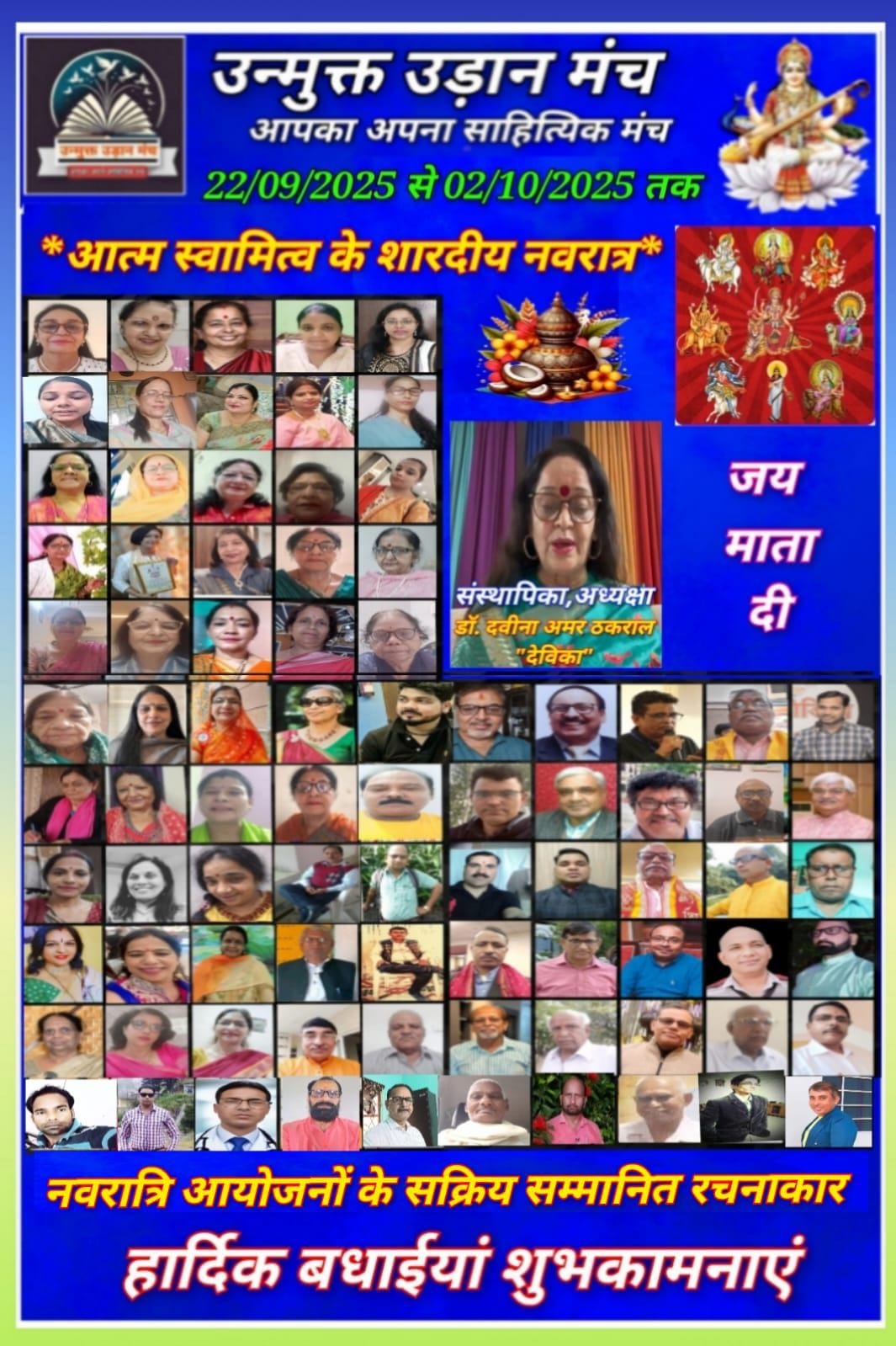 उन्मुक्त उड़ान मंच द्वारा नवरात्रि के पावन अवसर पर नवरात्रि विशेष काव्य गोष्ठी का सफल आयोजन किया गया। इस अनूठे कार्यक्रम में माँ दुर्गा के नौ रूपों को भावपूर्ण श्रद्धांजलि अर्पित करते हुए सभी रचनाकारों ने अपने-अपने अंदाज़ में गीतों और कविताओं के माध्यम से माँ की वंदना की। विशेष आकर्षण यह रहा कि प्रत्येक रचनाकार ने माँ के प्रिय रंग के वस्त्र धारण कर मंच की गरिमा प्रदान की।