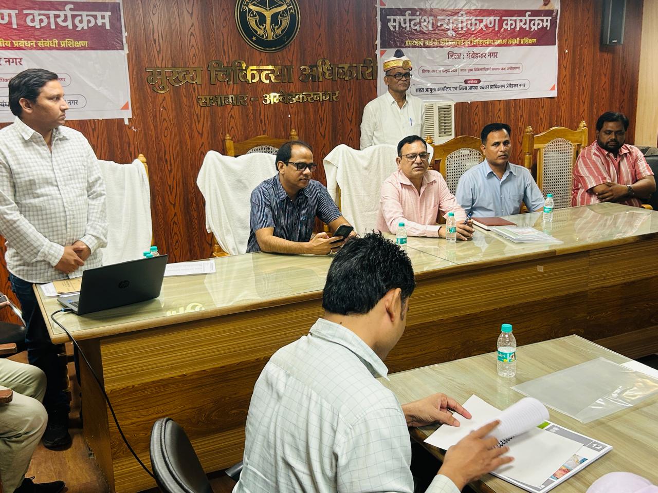 अम्बेडकर नगर। राहत आयुक्त कार्यालय एवं जिला आपदा प्रबंधन प्राधिकरण, अंबेडकर नगर के संयुक्त तत्वाधान में सर्पदंश से बचाव एवं प्रबंधन विषय पर कार्यालय मुख्य चिकित्साधिकारी के सभागार में दो दिवसीय प्रशिक्षण कार्यशाला का आयोजन किया गया। प्रशिक्षण के दूसरे दिन आज 25 चिकित्साधिकारियों ने प्रतिभाग किया, जबकि पहले दिन भी 25 चिकित्साधिकारी प्रशिक्षित किए गए थे। इस प्रकार दो दिवसीय कार्यशाला में कुल 50 चिकित्साधिकारियों को प्रशिक्षण प्रदान किया गया। इस कार्यशाला का मुख्य उद्देश्य सर्पदंश के बढ़ते मामलों को रोकना एवं जनहानि को न्यूनतम करना रहा।