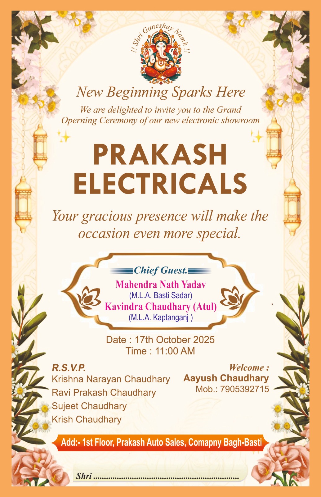 बस्ती ( अनुराग लक्ष्य न्यूज ) प्रकाश इलेक्ट्रिकल्स गांधी नगर बस्ती का भव्य शुभारंभ दिनांक 17 अक्टूवर दिन शुक्रवार समय 11.00 बजे दिन में होना सुनिश्चित हैं।