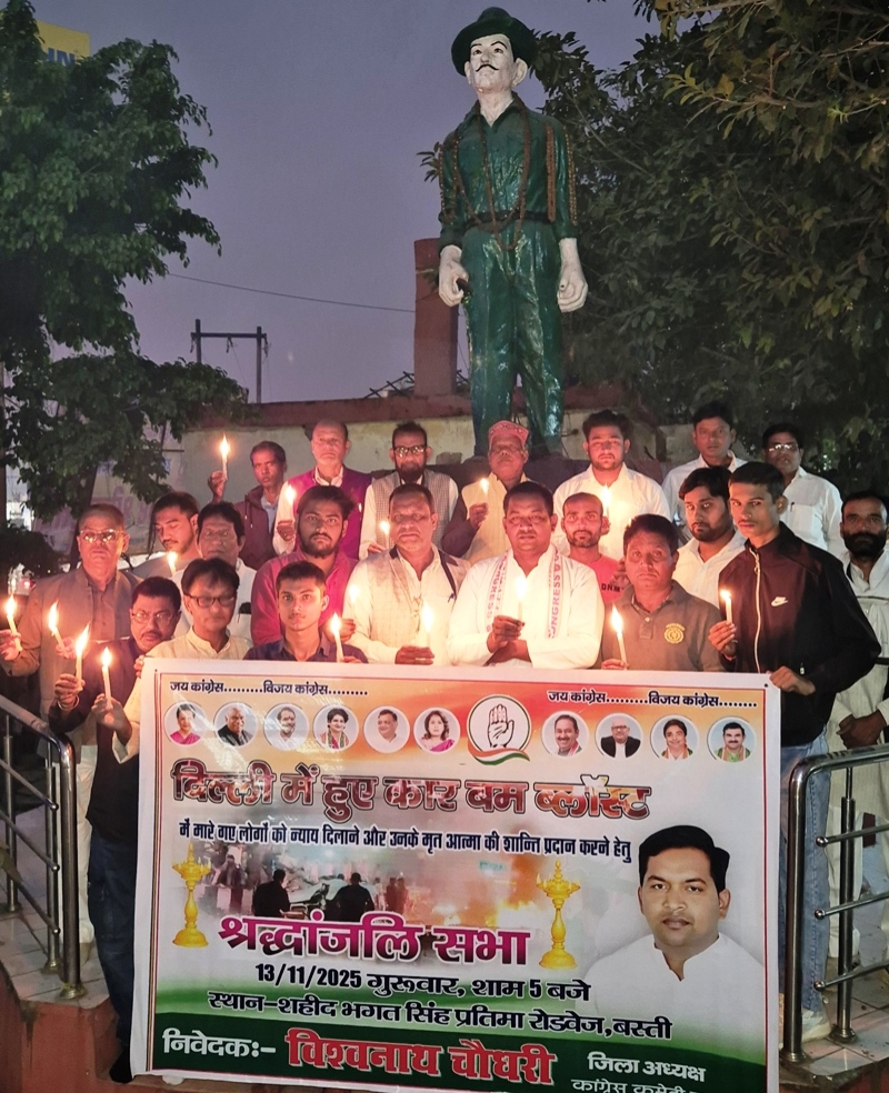बस्ती (अनुराग लक्ष्य न्यूज ) दिल्ली में लाल किला मेट्रो स्टेशन के सामने हुए बम धमाके में मारे गए आम नागरिकों के दिवंगत आत्मा की शांति और आतंकवाद के खात्मे हेतु गुरूवार की शाम को कांग्रेस अध्यक्ष विश्वनाथ चौधरी के नेतृत्व में कैंडल मार्च निकाला गया। रोडवेज तिराहा स्थित शहीदे आजम भगत सिंह प्रतिमा के निकट कैन्डिल मार्च संक्षिप्त सभा के साथ सम्पन्न हुआ। कांग्रेस के अनेक कार्यकर्ता पदाधिकारी एवं आम जनमानस इसमें शामिल हुए। सभी लोगों ने दिवंगत आत्मा की शांति हेतु एक मिनट का मौन रखकर श्रद्धांजलि समर्पित किया। इस दौरान भीड़ ने आतंकवाद मुर्दाबाद और आतंकियों को गिरफ्तार करो के नारे लगाए।