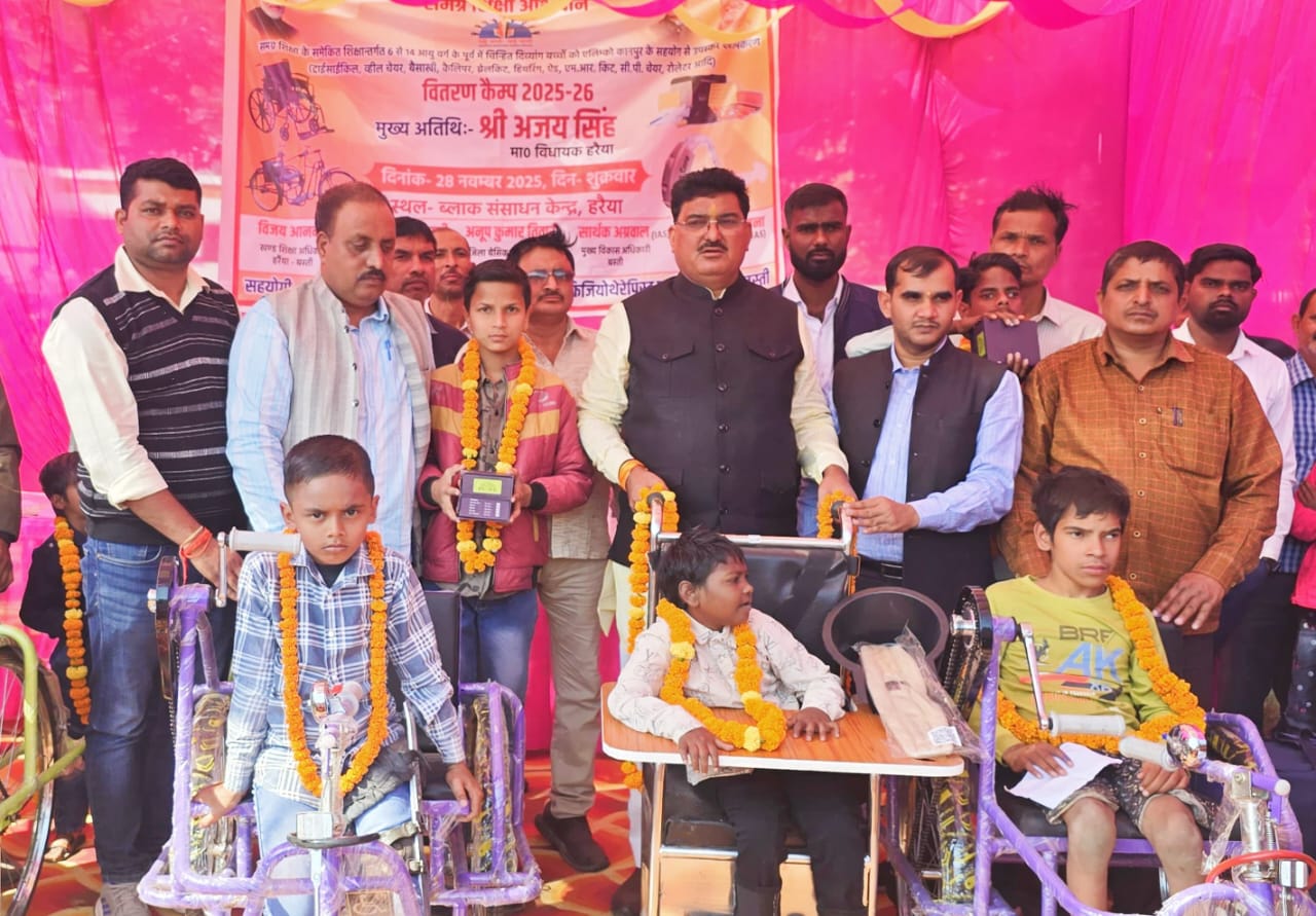बस्ती। जूनियर हाईस्कूल हर्रैया के परिसर में शुक्रवार को 6 से 14 वर्ष तक के दिव्यांग बच्चों के लिए सहायक उपकरण वितरण कार्यक्रम का आयोजन किया गया। कार्यक्रम के मुख्य अतिथि स्थानीय विधायक अजय सिंह ने मां सरस्वती के चित्र पर माल्यार्पण और दीप प्रज्ज्वलित कर कार्यक्रम का शुभारंभ किया। विधायक के हाथों 201 दिव्यांग बच्चों में कुल 346 सहायक उपकरण का वितरण किया गया। कार्यक्रम का आयोजन समग्र शिक्षा के समेकित शिक्षा और एल्मिको कानपुर के सहयोग से किया गया। समेकित शिक्षा के जिला समन्वयक सुनील त्रिपाठी, एल्मिनो कानपुर के पंकज आनंद और बालगोपाल, ब्लॉक के एआरपी रवीश कुमार मिश्र और शिक्षक गिरिजेश बहादुर सिंह की उपस्थिति में 201 बच्चों में वितरित किए गए 346 उपकरणों में 29 ट्राईसाईकिल, 75 व्हीलचेयर, 68 सीपी चेयर, 54 हियरिंग एड, 18 बैसाखी, 82 टीएलएम किट, 8 ब्रेल किट और 12 रोलेटर का वितरण किया गया। विधायक ने दिव्यांग बच्चों उनके अभिभावकों और उपस्थित जनसमूह को संबोधित करते हुए कहा कि दिव्यांग बच्चों की शिक्षा के लिए सरकार बहुत गंभीर है उनकी मदद के लिए एस्कार्ट अलाउंस योजना, छात्रवृत्ति, घर आधारित शिक्षा, समावेशी शिक्षा आदि सुविधाएं सरकार द्वारा उपलब्ध कराई हैं। कहा कि जब दिव्यांग बच्चे सामान्य बच्चों के साथ पढ़ेंगे, खेलेंगे और संवाद करेंगे, तभी उनमें आत्मविश्वास और समाज से जुड़ाव बढ़ेगा। इससे भेदभाव की दीवारें टूटेंगी और समाज में समानता और समावेशिता की भावना मजबूत होगी। जिला समन्वयक सुनील त्रिपाठी ने अभिभावकों से अपील की कि वे बच्चों को प्राप्त उपकरणों का उचित उपयोग करवाएं और सुनिश्चित करें कि बच्चे इन उपकरणों के साथ ही विद्यालय पहुंचें। उन्होंने अभिभावकों को उपकरणों के रखरखाव के बारे में भी जानकारी दी इस अवसर पर अखिलेश सिंह, भरत सिंह, वीरू सिंह, बीआरसी कार्यालय के राकेश प्रकाश श्रीवास्तव, सुनील कुमार, ऋषि सिंह, राजेश वर्मा, दिवाकर सिंह, जमुना, राकेश आदि उपस्थित रहे।