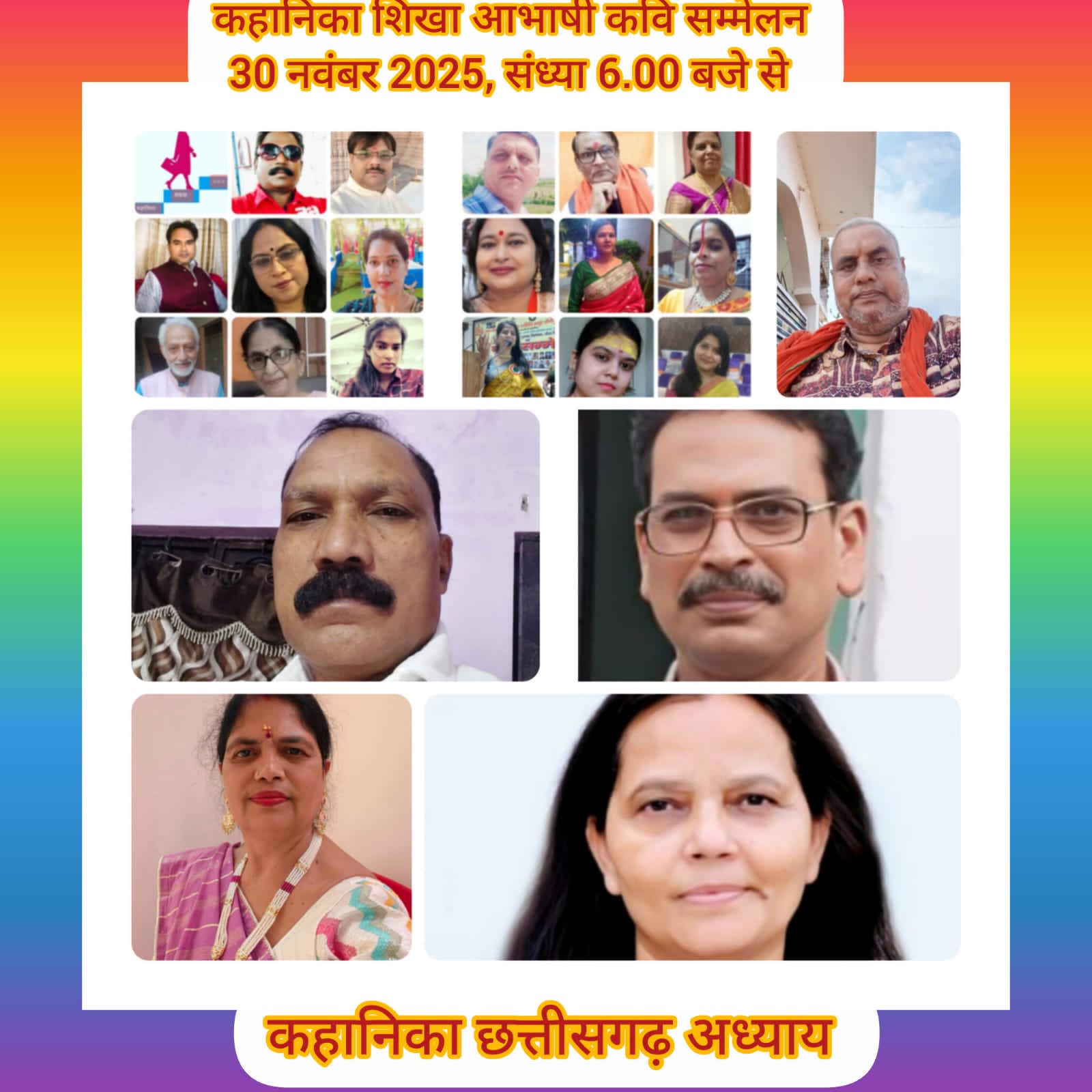 कहानिका हिंदी पत्रिका (महिला कल्याण समिति धोरी,बोकारो द्वारा संचालित) के छत्तीसगढ़ अध्याय द्वारा शिखा गोस्वामी निहारिका ,केंद्रिय सूचना प्रभारी और विभा तिवारी सह संपादक, कहानिका तथा छत्तीसगढ़ राज्य के स्थापना दिवस के पच्चीस वर्ष पूरे होने के अवसर पर 30 नवंबर ‘2025 को भव्य आभाषी कवि सम्मेलन का आयोजन किया गया ।