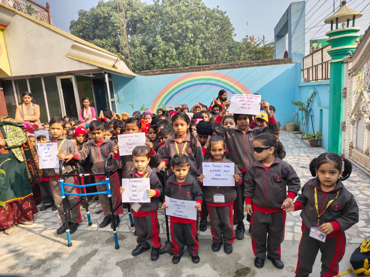 समस्त विद्यालय परिवार ने स्लोगन्स के जरिये दिव्यांगों के प्यार, सम्मान, साथ और सहयोग की अपील की। मेरी अक्षमता में ही मेरी सच्ची क्षमता है।