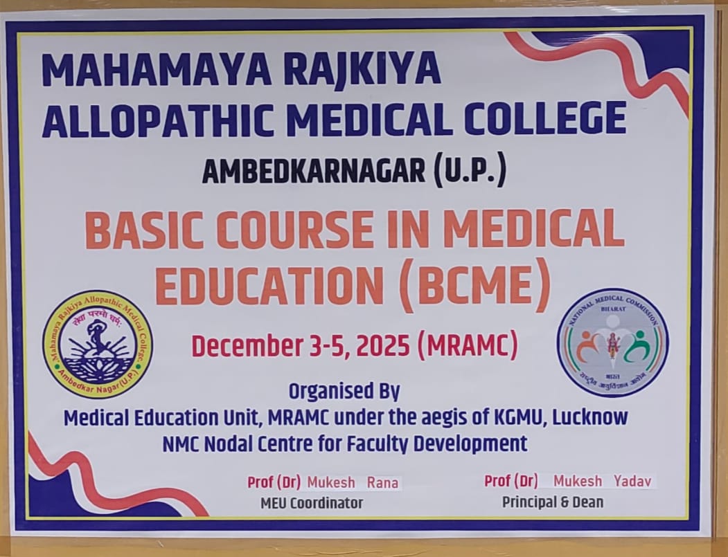 अम्बेडकर नगर ।महामाया राजकीय एलोपैथिक मेडिकल कॉलेज में राष्ट्रीय चिकित्सा आयोग (एन एम सी) की अनुमति से 3 से 5 दिसंबर तक Basic Course in Medical Education (BCME) Faculty Development Program आयोजित किया जा रहा है। चिकित्सा शिक्षा में बुनियादी पाठ्यक्रम (BCME) में शिक्षण विधियों, शैक्षणिक दर्शन, और मूल्यांकन तकनीकों जैसे विषयों को शामिल किया जाता है। इसका उद्देश्य चिकित्सा शिक्षकों के शिक्षण कौशल और ज्ञान को बढ़ाना है ताकि वे छात्रों को बेहतर तरीके से प्रशिक्षित कर सकें। इसमें प्रभावी शिक्षण, पाठ्यक्रम विकास, मूल्यांकन योजना और सीखने के उद्देश्यों को डिजाइन करने जैसे व्यावहारिक पहलुओं पर ध्यान केंद्रित किया जाता है। यह कार्यक्रम मेडिकल शिक्षा में गुणवत्ता सुधार, आधुनिक शिक्षण विधियों के उपयोग और संकाय सदस्यों की शैक्षणिक क्षमता को सुदृढ़ करने के उद्देश्य से आयोजित किया गया है।