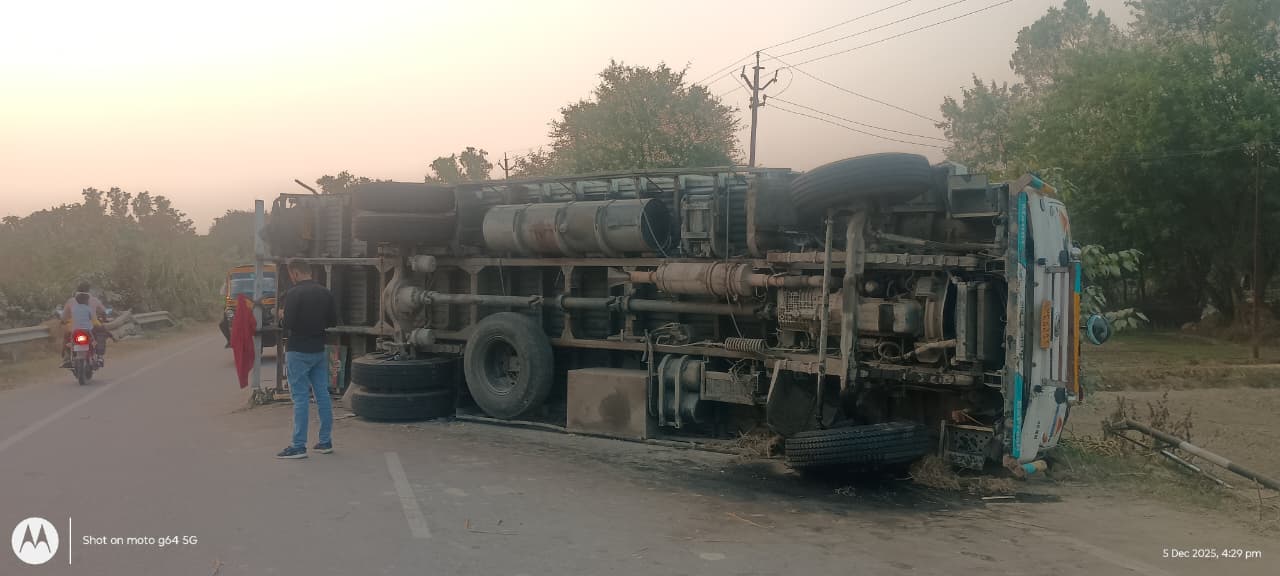 संतकबीर नगर जनपद के धनघटा की तरफ से आ रही सेब लदा ट्रक चकिया गांव के पास पहुंचा ही था कि अनियंत्रित हो कर मार्ग पर पलट गया। स्थानीय लोगो ने पहुंच कर चालक को सुरक्षित बाहर निकाला। जिसमें किसी को चोट नही आयी और बाल बाल बच गये। चालक जावेद ने बताया कि सिकरीगंज मंडी जाना था। रात में रास्ता भटक गया और राम जानकी मार्ग पकड कर कलवारी की तरफ बढ़ गया। अचानक ट्रक अनियंत्रित हो कर पलट गयी।