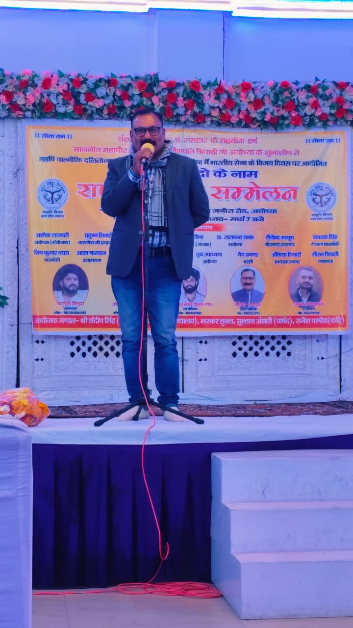 युवा ही देश की अस्मिता के रक्षक: महापौर मुख्य अतिथि अयोध्या के महापौर महंत श्री गिरीश पति त्रिपाठी ने कहा कि आज के युवाओं को देशहित में आगे आकर अपना योगदान देना चाहिए। उन्होंने भावुक होते हुए कहा, “भारत है तो हम हैं और हम हैं तो देश की अस्मिता पर कोई आंच नहीं आ सकती। देर रात तक जमी काव्य गोष्ठी विकास सिंह ‘बौखल’: बाराबंकी से आए विकास सिंह ने अपनी हास्य रचनाओं से संचालन करते हुए सबको हंसाया। अनुराग मिश्र ‘गैर’: उन्नाव से आए सहायक आबकारी आयुक्त ने गजल के जरिए समां बांधा।कु. कृपा संगम: सतना से पधारी कवयित्री ने माँ शारदे की वंदना से कार्यक्रम का शुभारंभ किया।अटल नारायण व प्रद्युम्न नाथ तिवारी: प्रयागराज के इन कवियों ने ओज और अध्यात्म की त्रिवेणी बहाई।अंकिता तिवारी: अंबेडकर नगर की अंकिता ने “यही अयोध्या धाम हो” पढ़कर सबका मन मोह लिया। सम्मेलन में स्थानीय हस्ताक्षर राजीव मतवाला, शिव कुमार व्यास, तटेश मिश्र, वेद प्रकाश ‘प्रचण्ड’ और सौरभ त्रिपाठी ने भी उत्कृष्ट प्रस्तुति दी। आभार व समापन