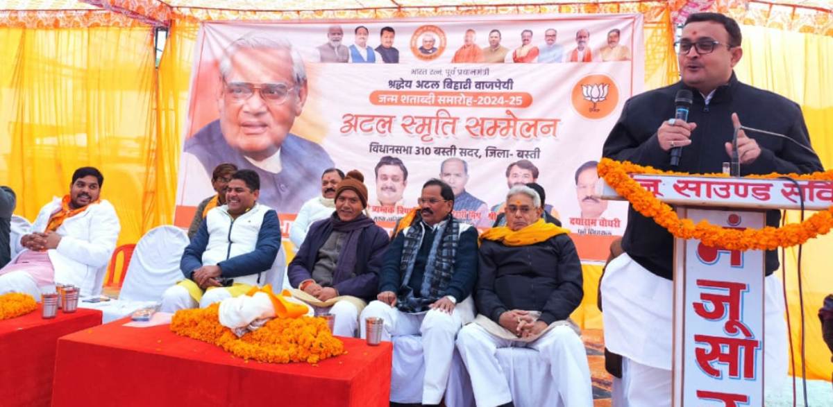 बस्ती। सोमवार को भारतीय जनता पार्टी द्वारा पूर्व विधायक दयाराम चौधरी के संयोजन में गनेशपुर कस्बे में स्थित गोल्डेन मैरेज हाल में अटल स्मृति सम्मेलन का आयोजन किया गया। मुख्य अतिथि भाजपा के प्रदेश उपाध्यक्ष त्रयम्बक त्रिपाठी ने कहा कि अटल बिहारी वाजपेयी भारतीय लोकतंत्र के सजग प्रहरी के साथ राष्ट्रीय अस्मिता के सशक्त प्रतीक थे। कहा कि वाजपेयी जी ने विपक्ष में रहते हुए भी राष्ट्रहित को सर्वोपरि रखा और अपने आदर्शों, नैतिकता व संवादशील राजनीति के माध्यम से सार्वजनिक जीवन को नई दिशा प्रदान की।