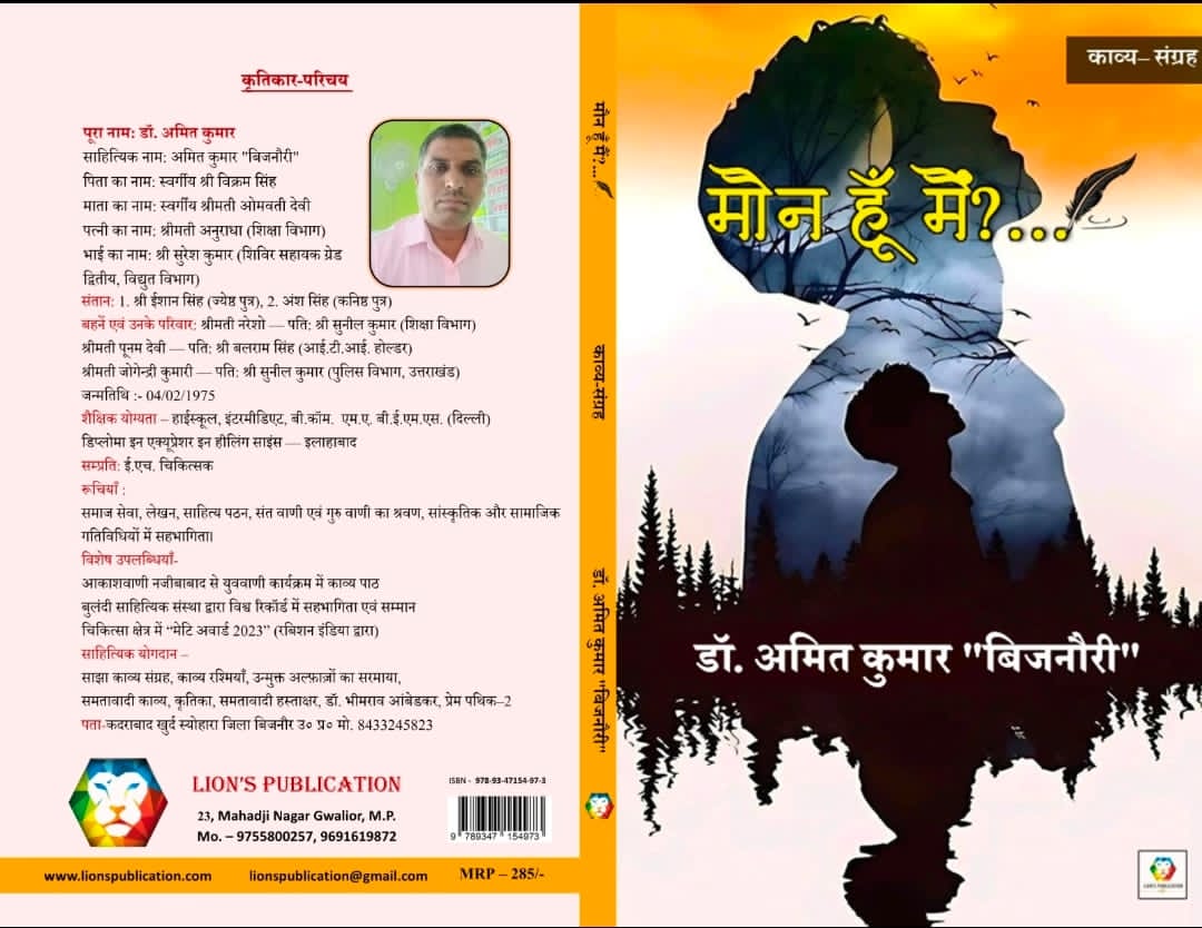 युवा कवि एवं साहित्यकार एवं नव साहित्य परिवार भारत के संस्थापक/नव साहित्य ई पत्रिका के संपादक डॉ. अमित कुमार बिजनौरी के प्रथम काव्य संग्रह ‘मौन हूँ मैं’ के प्रकाशित होते ही साहित्यिक जगत में हर्ष और उत्साह का वातावरण बन गया है।