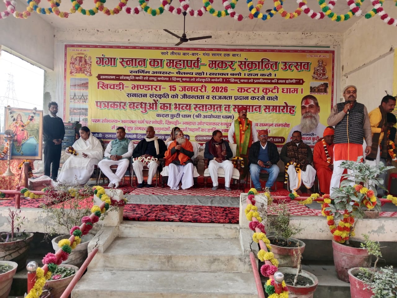 अयोध्या धाम के समीप स्थित क्षेत्र नवाबगंज गोंडा के सुप्रसिद्ध कटरा कुटी धाम मंदिर परिसर में बुधवार को मकर संक्रांति का पावन पर्व पूरी श्रद्धा, आस्था और सनातन परंपराओं के साथ धूमधाम से मनाया गया। कड़ाके की ठंड के बावजूद प्रातः काल से ही मंदिर में श्रद्धालुओं का तांता लगा रहा। भगवान की विशेष पूजा-अर्चना के साथ पर्व का शुभारंभ हुआ, जिसके बाद आयोजित विभिन्न कार्यक्रमों ने उत्सव की गरिमा को और बढ़ा दिया। सनातन संस्कृति पर विचार गोष्ठी इस अवसर पर मंदिर परिसर में ‘सनातन संस्कृति और भारतीय परंपराएं’ विषय पर एक विचार गोष्ठी का आयोजन किया गया। गोष्ठी को संबोधित करते हुए वक्ताओं ने मकर संक्रांति के आध्यात्मिक, सामाजिक और वैज्ञानिक महत्व पर प्रकाश डाला। उन्होंने कहा कि सूर्य का उत्तरायण होना सकारात्मक ऊर्जा, सेवा और सामाजिक समरसता का प्रतीक है। महंत चिन्मयानंद का संदेश मंदिर के महंत स्वामी चिन्मयानंद ने श्रद्धालुओं को संबोधित करते हुए कहा, “मकर संक्रांति हमें प्रकृति के प्रति कृतज्ञता, परिश्रम और संयम का संदेश देती है। खिचड़ी भोज आपसी भाईचारे और समानता का प्रतीक है, जहाँ ऊंच-नीच का भेद मिटाकर सभी एक साथ प्रसाद ग्रहण करते हैं। यह पर्व समाज को जोड़ने और आध्यात्मिक चेतना जगाने का माध्यम है। पत्रकार व समाजसेवी हुए सम्मानित