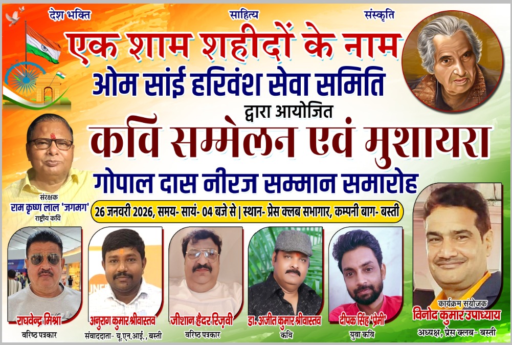 कार्यक्रम के संयोजक एवं प्रेस क्लब बस्ती के अध्यक्ष विनोद कुमार उपाध्याय ने बताया है कि यह कवि सम्मेलन प्रेस क्लब के सभागार में अपराह्न 4 बजे से 26 जनवरी को आयोजित होगा।