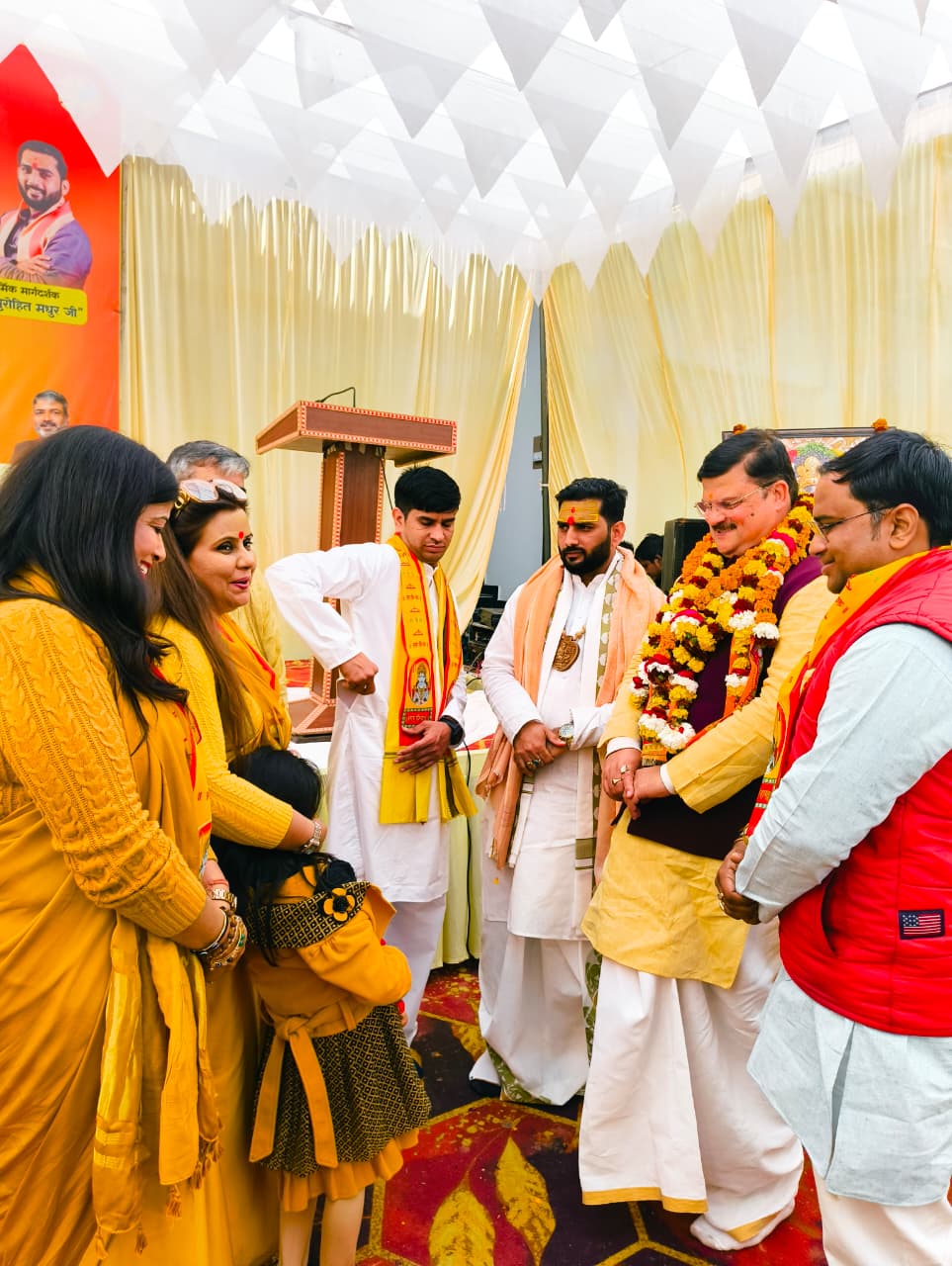 कार्यक्रम में मुख्य अतिथि के रूप में महंत मिथिलेश नन्दिनी शरण जी महाराज उपस्थित रहे। उनके साथ विशिष्ट अतिथि के तौर पर अभय सिंह जी और धर्म मार्गदर्शक राजपुरोहित मधुर जी ने अपनी गरिमामयी उपस्थिति दर्ज कराई। कार्यक्रम के दौरान वक्ताओं ने अयोध्या की सांस्कृतिक विरासत को वैश्विक स्तर पर ले जाने के प्रयासों की सराहना की। विशेष उपलब्धियां समारोह के मुख्य आकर्षणों में शामिल रहे। पर्वतारोहण की सफलता: पर्वतारोही नरेंद्र कुमार को उनकी साहसिक यात्रा और माउंट एवरेस्ट बेस कैंप तक धर्म ध्वज फहराने के लिए सम्मानित किया गया। संस्थान की वर्षगांठ ब्लू नेक होटल के एक सफल वर्ष पूरा होने पर आयोजक आशीष सारण और ऋतुराज भारद्वाज ने आगंतुकों का आभार व्यक्त किया। सांस्कृतिक एकता का संदेश आयोजकों ने बताया कि इस यात्रा का उद्देश्य अयोध्या की आध्यात्मिक ऊर्जा को विश्व की सबसे ऊंची चोटियों तक पहुँचाना और युवाओं में साहस व धर्म के प्रति जागरूकता पैदा करना है। कार्यक्रम का समापन सामूहिक आरती और प्रसाद वितरण के साथ हुआ।