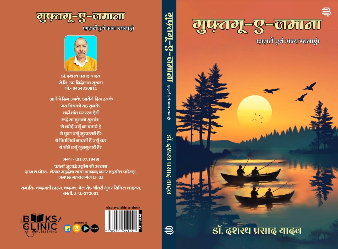 बस्ती। सेवा निवृत्त उप निदेशक सूचना डॉ. दशरथ प्रसाद यादव कृत गुफ़्तगू-ए- जमाना ग़ज़लें और अन्य रचनाओं का प्रकाशन बुक्स क्लीनिक पब्लिशिंग बिलासपुर छत्तीसगढ से प्रकाशित हुई है। पुस्तक का मूल्य 380 रूपये है। गुफ़्तगू-ए- जमाना ग़ज़लें पाठको में लोकप्रिय हो रही है। ‘सुनहरे दिन आयेंगे ऐसा मत विश्वास कर, होके कर्तव्यनिष्ठ खुशी की तलाश कर’ जैसे प्रेरक ग़जलों और अन्य रचनाओं के माध्यम से डॉ. दशरथ प्रसाद यादव ने युगीन सत्य को स्वर दिया है। गुफ़्तगू-ए- जमाना ग़ज़लें और अन्य रचनाओं में रचनाकार ने जीवन की अनेक संगति, विसंगति, आशंका और अनन्त संभावनाओं को स्वर दिया है।