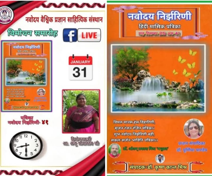 नवोदय वैश्विक प्रज्ञान साहित्यिक संस्थान द्वारा प्रकाशित ‘नवोदय निर्झरिणी ई मासिक पत्रिका ‘माह दिसंबर’2025 अंक का आभासी विमोचन वरिष्ठ कवयित्री अंजू श्रीवास्तव द्वारा 31 जनवरी को विमोचन किया गया। संस्थान के संस्थापक डा. ओम प्रकाश मिश्र ‘मधुब्रत’ के मार्गदर्शन पत्रिका की प्रधान संपादिका डा. पूर्णिमा पाण्डेय ‘पूर्णा’ एवं संपादक डा. कृष्ण कांत मिश्र द्वारा संपादित पत्रिका में मंच के तमाम साहित्यकारो ने विभिन्न विषयों पर अपनी लेखनी चलाकर इस पत्रिका में अपने मनोभाव को काव्य के विविध विधा की रचनाओं से अपना रचनात्मक सहयोग प्रदान किया है।