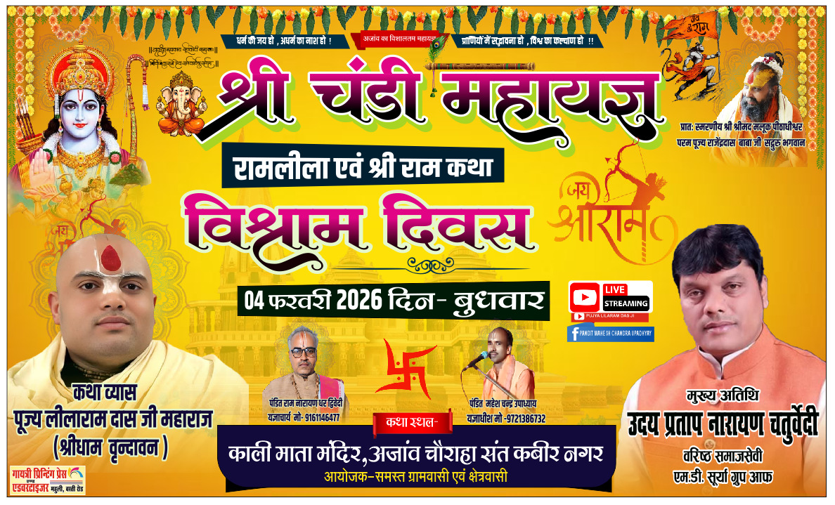 संतकबीरनगर। नाथनगर ब्लॉक क्षेत्र के ग्राम अजांव में बीते 27 जनवरी से चल रहे नौ दिवसीय श्रीचंडी महायज्ञ का बुधवार को भव्य समापन किया जाएगा। कबीर की पावन धरती पर आयोजित इस धार्मिक अनुष्ठान के समापन समारोह में समाजसेवा और धर्म के ध्वजवाहक, सूर्या ग्रुप के चेयरमैन डॉ. उदय प्रताप चतुर्वेदी बतौर मुख्य अतिथि शामिल होंगे। आयोजन समिति ने उनके स्वागत को लेकर तैयारियां तेज कर दी हैं।