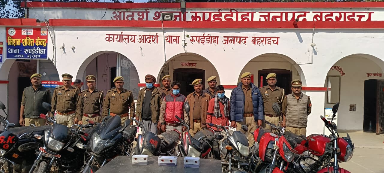 विवरणः- पुलिस अधीक्षक महोदय जनपद बहराइच द्वारा अपराध एवं अपराधियों की रोकथाम एवं चोरी व वाहनो की चोरी की घटनाओं पर अंकुश लगाने व चोरो की गिरफ्तारी व चोरी गये वाहनो की बरामदगी हेतु चलाये जा रहे अभियान के क्रम में अपर पुलिस अधीक्षक महोदय (ग्रामीण) श्री दुर्गा प्रसाद तिवारी व श्रीमान क्षेत्राधिकारी महोदय नानपारा श्री पहुप सिंह के कुशल नेतृत्व व प्रभारी निरीक्षक श्री रमेश सिंह रावत के पुलिस टीम द्वारा दिनांक 11.02.2026 को ICP चौराह से पचपकड़ी मार्ग पर गश्त के दौरान एक मोटरसाइकिल पर 03 व्यक्ति संदिग्ध तीनो व्यक्तियों को रोककर नाम पता पूछा गया तो तीनो ने अपना नाम क्रमशः 01. साहरुप खाँ उर्फ टोर्रा पुत्र मो0 सफीक खाँ उम्र 22 वर्ष 2. अरमान खाँ पुत्र नफीस खाँ उम्र करीब 21 वर्ष 03. नफीस खाँ पुत्र सरीफ खाँ उम्र करीब 42 वर्ष निवासीगण मलऊपुरवा डुडुवा ग्राम पालिका वार्ड संख्या 04 जिला बांके थाना कमदी राष्ट्र नेपाल बताये तथा गाड़ी के कागजात व भागने का कारण पूछा गया तो कोई प्रपत्र नहीं दिखा सके तथा मोटरसाइकिल हीरो स्प्लेण्डर UP32MC0297 थाना नानपारा से चोरी कर नेपाल ले जाना बताये । पुलिस टीम द्वारा और कड़ाई से पूछताछ करने पर उक्त अभियुक्तों द्वारा चकिया जंगल में झाड़ी में छुपाये 09 अदद अन्य चोरी की मोटरसाइकिल को पुलिस टीम द्वारा बरामद किया गया । जिसे उक्त अभियुक्तों द्वारा भिन्न भिन्न स्थानों से चोरी किया जाना बताये जो थाना नानपारा, थाना रिसिया, थाना रामगाँव, थाना कोतवाली नगर, थाना कोतवाली देहात, थाना दरगाह शरीफ, इन्दिरा नगर लखनऊ, जानकीपुरम लखनऊ, जनपद लखीमपुर खीरी, जनपद गोण्डा से सम्बन्धित है । मौके पर उक्त तीनो अभियुक्तों को उनके जुर्म का बोध कराते हुए दिनांक 12.02.2026 को समय 01.13 बजे पुलिस हिरासत में लिया गया । फर्द बरामदगी व गिरफ्तारी के आधार पर थाना स्थानीय पर मु0अ0सं0 32/2026 धारा 317(2), 317(4), 341(2) बी0एन0एस0 बनाम उपरोक्त पंजीकृत किया गया एवं बाद आवश्यक विधिक कार्यवाही अभियुक्त को पेशी हेतु माननीय न्यायालय सदर बहराइच रवाना किया गया l