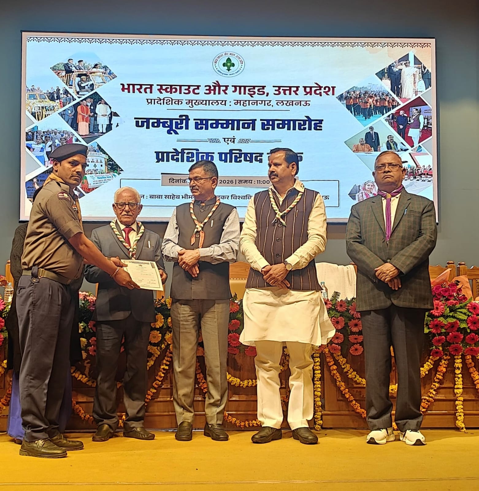 बस्ती। प्रादेशिक परिषद बैठक एवं जंबूरी सम्मान समारोह में प्रदेश अध्यक्ष डॉक्टर महेंद्र देव सिंह, प्रादेशिक मुख्य आयुक्त डॉक्टर प्रभात कुमार एवं प्रादेशिक उपाध्यक्ष गणों की उपस्थिति में अजय कुमार वर्मा सहायक अध्यापक झिनकू लाल त्रिवेणी राम चौधरी इंटर कॉलेज कलवारी बस्ती को ALT (S) का ऑनरेबुल चार्ज एवम सम्मान प्रदान किया गया।*