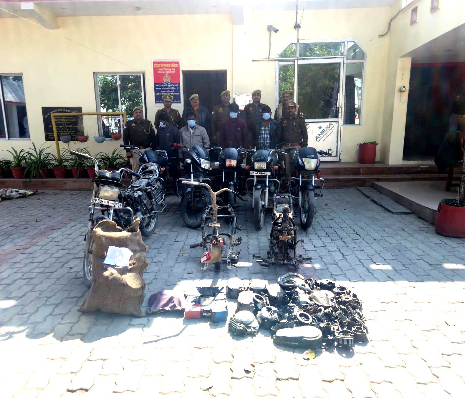 – 05 अदद चोरी के मोटर साइकिल व 03 अदद मोटर साइकिल की चेचिस व 04 अदद कटे हुए मोटर साइकिल के इंजन मय पुर्जों के साथ 04 अभियुक्त गिरफ्तार