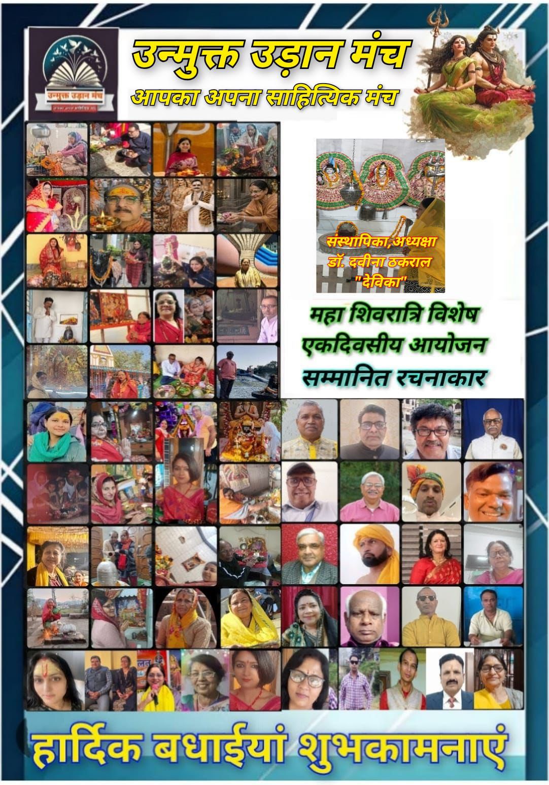 महाशिवरात्रि के पावन अवसर पर उन्मुक्त उड़ान मंच द्वारा एक भव्य साहित्यिक आयोजन संपन्न किया गया, जिसमें देश-विदेश से जुड़े 66 रचनाकारों ने उत्साहपूर्वक अपनी रचनात्मक प्रस्तुतियाँ दीं। दोहे, छंदमुक्त कविता, मुक्तक एवं विविध काव्य विधाओं में प्रत्येक रचनाकार ने चार पंक्तियों के माध्यम से भगवान शिव के प्रति अपनी श्रद्धा और भक्ति अर्पित की।