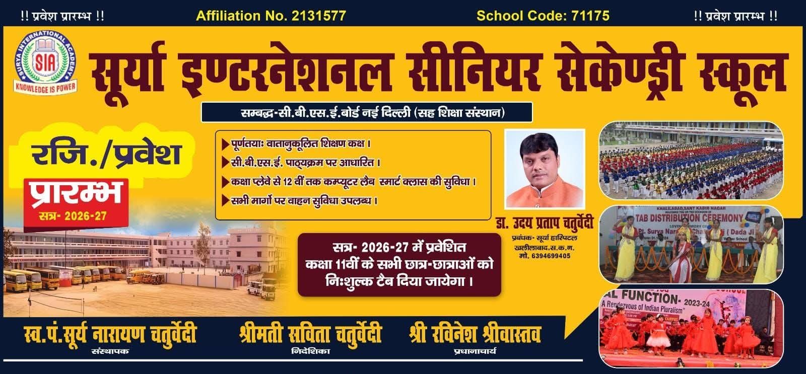 संतकबीरनगर। जनपद के प्रतिष्ठित शिक्षण संस्थान सूर्या सीनियर सेकेंडरी स्कूल खलीलाबाद में नए शैक्षणिक सत्र के प्रवेश को लेकर अभूतपूर्व उत्साह देखने को मिल रहा है। बीती 1 फरवरी से प्रारंभ हुए पंजीकरण अभियान में प्रतिदिन बड़ी संख्या में छात्र-छात्राएं एवं