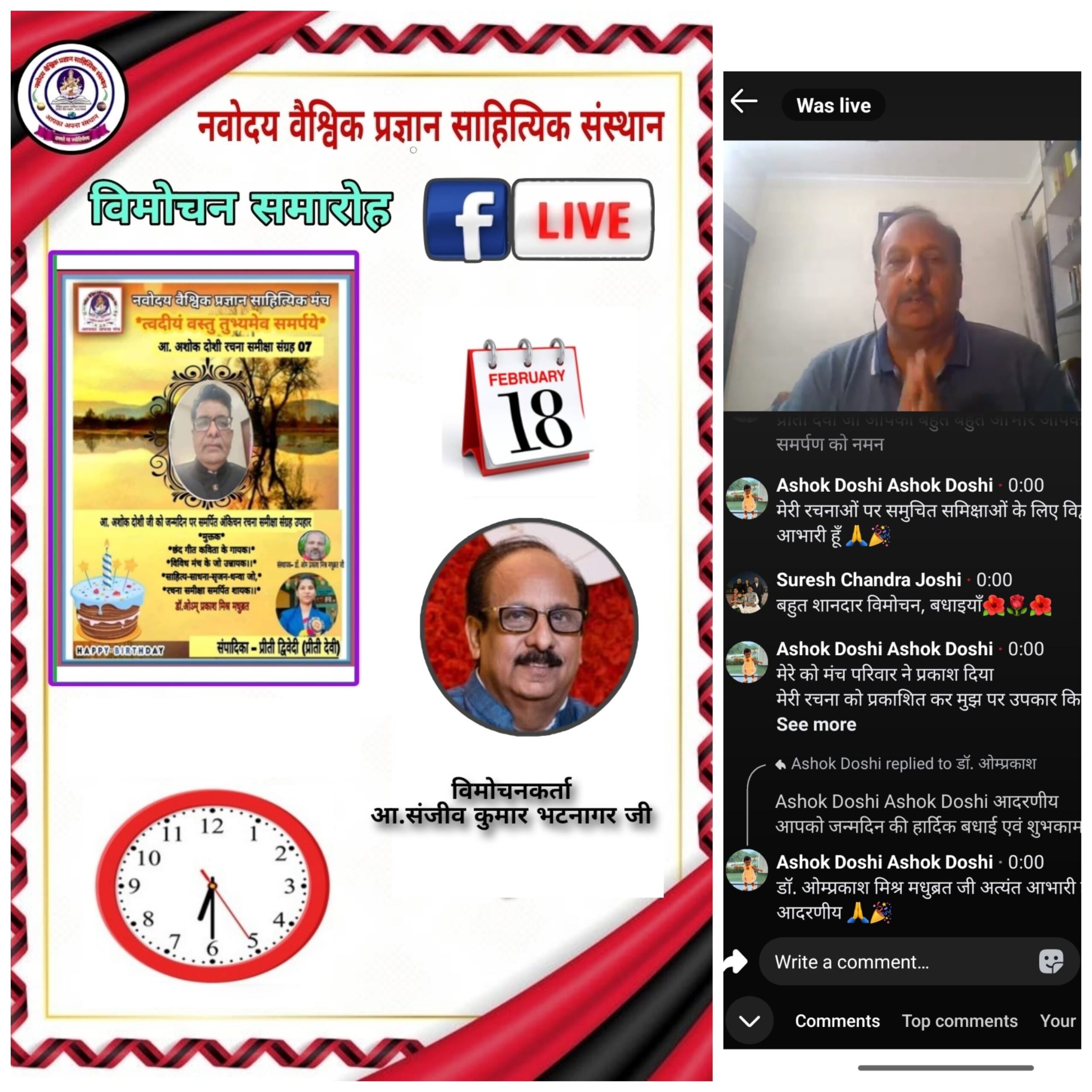 18 फरवरी 2026 दिन बुधवार को नवोदय वैश्विक प्रज्ञान साहित्यिक संस्थान द्वारा संस्थान के सचिव अशोक दोशी के जन्मदिन के शुभअवसर पर उन्हें त्वदीयं वस्तु तुभ्यमेव समर्पये अंक-7 एक नवीन पत्रिका उपहार स्वरूप प्रदान की गई। इस पत्रिका में संस्थान पर चले साप्ताहिक आयोजन में दोशी जी की रचनाओं पर आई हुई समीक्षाओं को स्थान दिया गया है। जिसमें संस्थान के तमाम साहित्यकारो ने अपनी लेखनी चलाकर इस पत्रिका में अपने समीक्षात्मक लेख को संकलित करने में अपना सहयोग प्रदान किया है। इस पत्रिका का संपादन डॉ ओउम् प्रकाश मिश्र के नेतृत्व में संस्थान की प्रमाणन अधीक्षिका डॉ प्रीती द्विवेदी ने किया। जिनकी मेहनत पत्रिका में साफ दिख रही है। इस पत्रिका का विमोचन वरिष्ठ कवि, साहित्यकार, लेखक संस्थान के महासचिव संजीव भटनागर ने सायं 6.30 बजे लाइव होकर क़िया। साथ ही अपनी शुभकामनाएं मधुरिम स्वर में प्रेषित किया। जन्मदिन के शुभअवसर पर संस्थान से जुड़े तमाम पदाधिकारियों के साथ-साथ अनेक रचनाकारों ने अपनी-अपनी शुभकामनाएं संजीव जी को प्रेषित किये। संस्थान के संस्थापक डॉ. ओउम् प्रकाश मिश्र ने बताया कि यह पत्रिका का-7वाँ अंक है। और इस पत्रिका को संस्थान के पदाधिकारियों के लिए बनाया गया है। जिसमें उनकी रचनाओं पर आई हुई समीक्षाओं को सम्मिलित किया जाता है। संस्थान के कार्यकारी अध्यक्षा डॉ पूर्णिमा पाण्डेय अपनी शुभकामनाओं के साथ विमोचनकर्ता का हौसला बढ़ाती रही। इसके साथ ही संस्थान पर तमाम रचनाकारों ने अपनी शुभकामनाएं प्रेषित की। विमोचन के इस अवसर पर अमिता गुप्ता, सुधीर श्रीवास्तव, सरिता सुराना, प्रीती द्विवेदी, राजीव रंजन मिश्र, रूपा माला, शशिकला नायक, गौतम सिंह अनजान, एकता गुप्ता, रंजना बिनानी, सुरेश चंद्र जोशी, अनिल राही, सहित तमाम श्रेष्ठ कवि कवयित्रियों ने अपनी उपस्थिति दर्ज कराकर मंगलकामनायें प्रेषित किये।