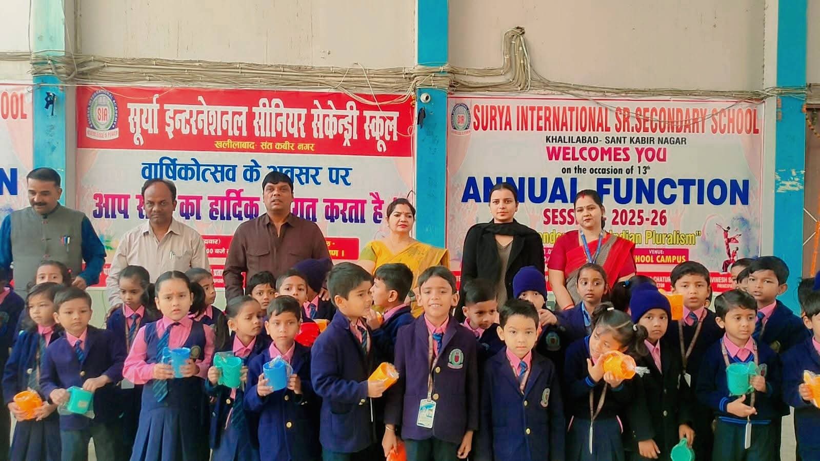 संतकबीरनगर। जनपद के प्रतिष्ठित शैक्षणिक संस्थान सूर्या सीनियर सेकेंडरी स्कूल में वार्षिक उत्सव के उपलक्ष्य में लगभग 1500 छात्र-छात्राओं को भव्य समारोह में सम्मानित किया गया। कार्यक्रम में विद्यालय प्रबंधन, शिक्षकगण, अभिभावक एवं छात्र-छात्राओं की उत्साहपूर्ण उपस्थिति रही। सम्मान पाकर बच्चों के चेहरे खुशी से खिल उठे और पूरा परिसर तालियों की गड़गड़ाहट से गूंज उठा।