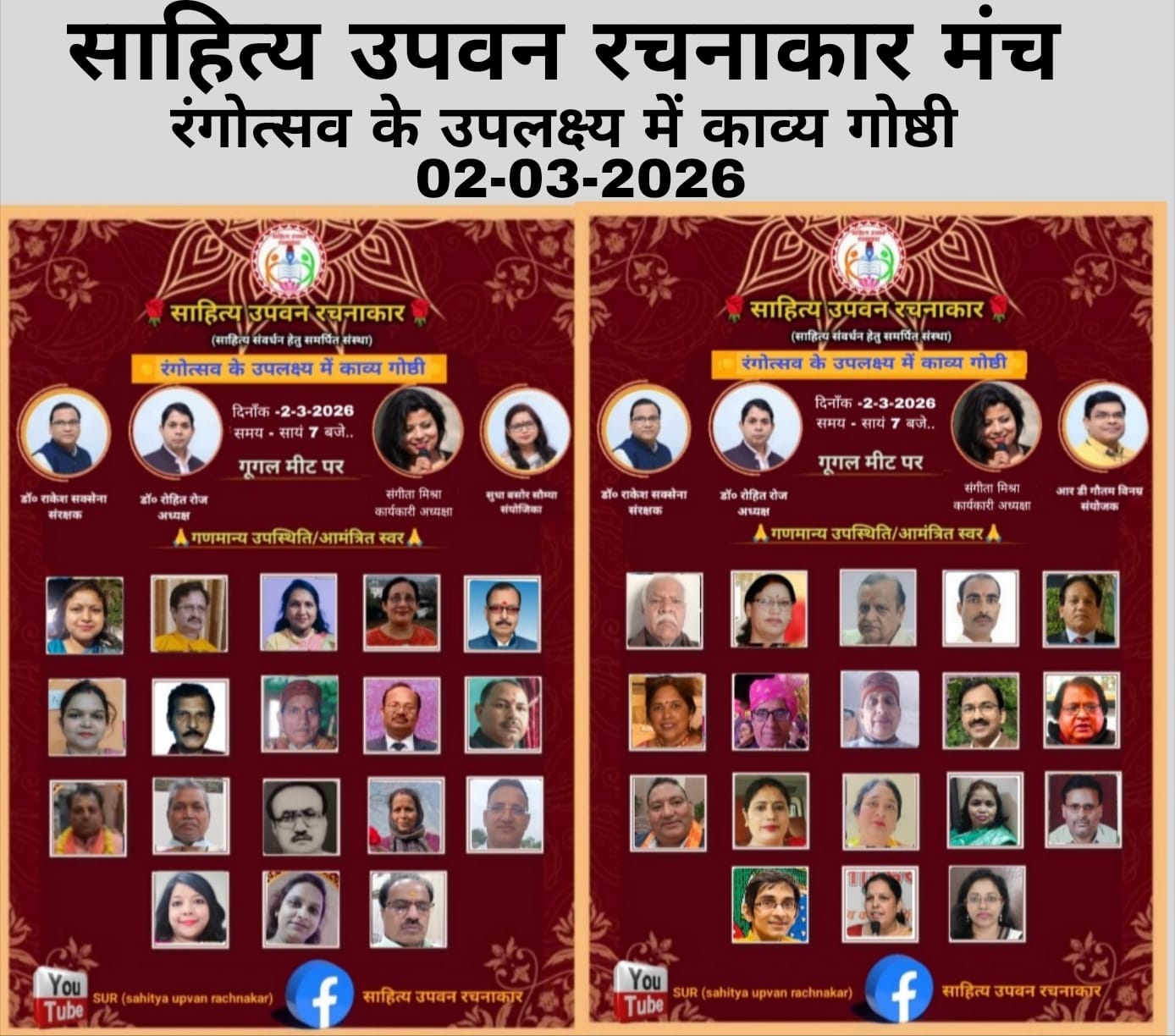 दिनांक 2 मार्च 2026 को साहित्य उपवन रचनाकार मंच के तत्वावधान में एक भव्य ऑनलाइन रंगोत्सव काव्य-गोष्ठी का सफल आयोजन किया गया। कार्यक्रम का शुभारंभ दिव्या भट्ट ‘स्वयं’ द्वारा प्रस्तुत सुमधुर सरस्वती वंदना से हुआ। इसके पश्चात देश के विभिन्न प्रांतों से जुड़े साहित्यकारों ने रंगोत्सव की भावना से ओतप्रोत गीत, ग़ज़ल, मुक्तक, कविता एवं छंद प्रस्तुत कर श्रोताओं को भाव-विभोर कर दिया।