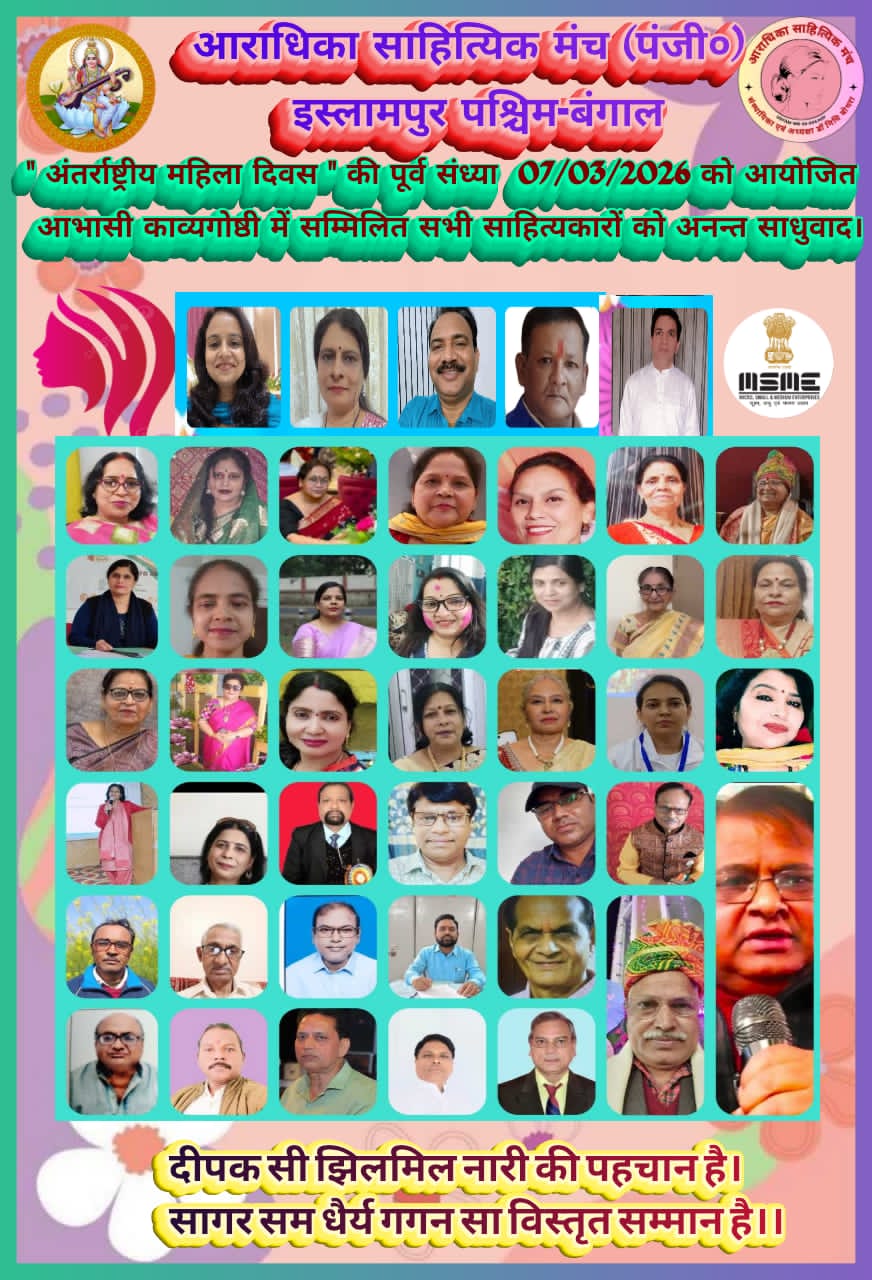 आराधिका साहित्यिक मंच (पंजी.) इस्लामपुर पश्चिम-बंगाल के तत्वावधान में ” अंतरराष्ट्रीय महिला दिवस ” की पूर्व संध्या पर 07 मार्च’ 2026 को मंच की 62 वीं भव्य आभासी काव्य गोष्ठी का आयोजन ‘ अंतरराष्ट्रीय महिला दिवस’ को केंद्र में रखकर आयोजित किया गया। जो 4.00 बजे से रात्रि 08:15 बजे तक निरंतर गतिमान रहकर भव्यता के साथ संपन्न हुई।