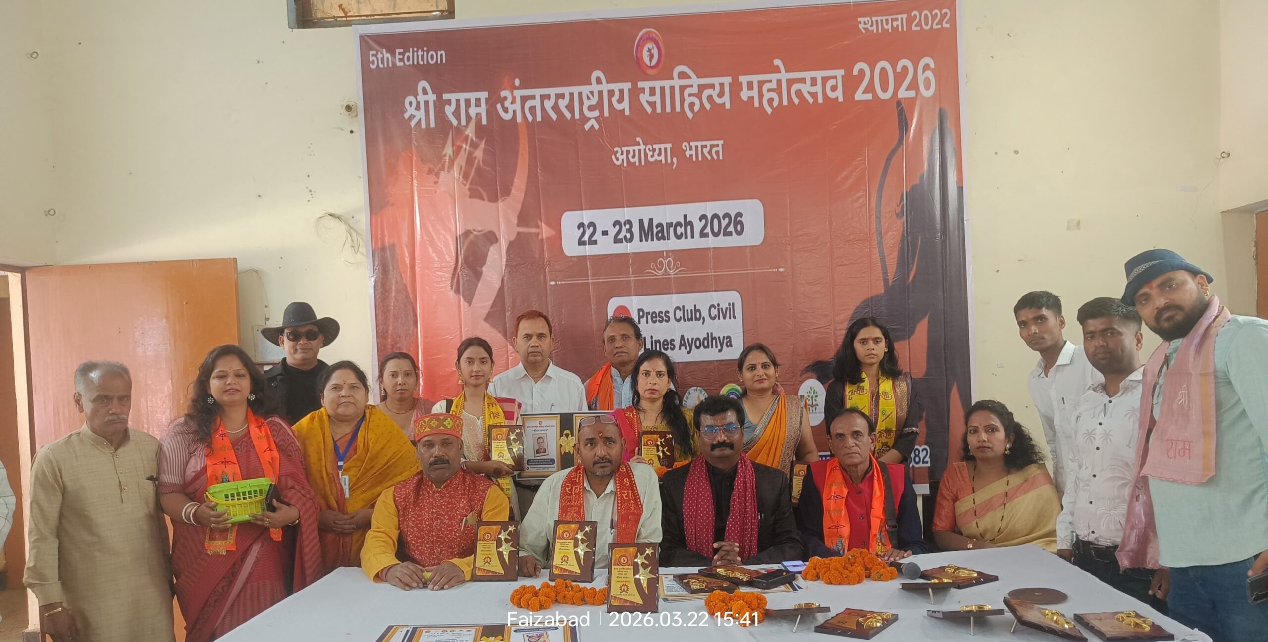 अयोध्या:- अयोध्या की पावन धरा धर्मनगरी के सिविल लाइंस में स्थित प्रेस क्लब में ‘श्रीराम अंतर्राष्ट्रीय साहित्य महोत्सव’ का पांचवा सफल संस्करण (स्थापना रामनवमी 2022) के मुख्य अतिथि हरिश श्रीवास्तव (भाजपा किसान मोर्चा क्षेत्रीय महामंत्री), कार्यक्रम अध्यक्ष डॉ. राम रतन श्रीवास “राधे राधे” बिलासपुर छत्तीसगढ़ (ब्रांड एंबेसडर- पशुपतिनाथ भारत नेपाल अंतर्राष्ट्रीय साहित्य महोत्सव काठमांडू नेपाल), नरेश बहादुर सिंदे, ताराचन्द्र ‘तन्हा’, डॉ. ललीत सिंह ठाकुर , (पार्श्व गायक भाटापारा छत्तीसगढ़), डॉ नरेन्द्र सिंह (वरिष्ठ पत्रकार अयोध्या,) के गरिमापूर्ण उपस्थिति में संपन्न हुआ। इस अवसर पर देश- दुनिया के साहित्यकारों की उपस्थिति और कार्यक्रम के दौरान डॉ. सुरेश प्रियदर्शी की अनुपस्थिति में विश्वविद्यालय की आधिकारिक उद्घोषणा डॉ. राम रतन श्रीवास “राधे राधे” द्वारा ‘श्रीराम इंटरनेशनल यूनिवर्सिटी’ और ‘श्रीराम गुरुकुलम्’ की एक युगांतरकारी घोषणा की गई। इस घोषणा के साथ ही यहांँ जय श्री राम से सभागार कक्ष में गूँजी उठी। ‘रामराज्य’ की गूँज से साहित्य और सुशासन का संगम देखने को मिला। इसके मुख्य सूत्रधार अंतरराष्ट्रीय कवि एवं वरिष्ठ पुलिस अधिकारी डॉ. सुरेश प्रियदर्शी हैं उनका कहना है कि ऐसे महोत्सव होते रहना चाहिए। डॉ. “राधे राधे” ने कहा कि डॉ. सुरेश प्रियदर्शी का उद्देश्य है कि विश्वविद्यालय वैश्विक स्तर पर ‘रामराज्य’ के सिद्धांतों न्याय, करुणा और सुशासन के आधार पर एक ‘बेहतर सभ्यता’ के निर्माण का केंद्र बनेगा। यह संस्थान दिनेश्वर वर्मा के मार्गदर्शन और स्वर्गीय सावित्री देवी की पावन स्मृति व प्रेरणा से आकार ले रहा है। श्रीराम गुरुकुलम् परंपरा और आधुनिकता का सेतु महोत्सव में चर्चा की गई कि विश्वविद्यालय परिसर के भीतर ही ‘श्रीराम गुरुकुलम्’ संचालित होगा। यह संस्थान प्राचीन भारतीय ऋषि-परंपरा, वेदों और उपनिषदों विज्ञान के ज्ञान को आधुनिक विज्ञान और तकनीक के साथ जोड़कर ऐसे वैश्विक नागरिक तैयार करेगा जो विश्व शांति, धर्म प्रचार और समग्र विकास के संवाहक बनेंगे। दिग्गज साहित्यकारों की गरिमामयी उपस्थिति में कार्यक्रम प्रभारी दुर्गेश पांडेय के संयोजन में आयोजित साहित्यिक कार्यक्रम किया गया। श्री राम अंतर्राष्ट्रीय साहित्य महोत्सव में शामिल रहे और शानदार कविताओं की बौछार हुई। सभी साहित्यकारों को श्रीराम सम्मान से सम्मानित किया गया। इसमें प्रतिभाग करने वाले बिहार से: डॉ. श्वेता शरण (सहरसा) , अनुपमा, डॉ. किरण कुमारी (भागलपुर), डॉ. रंजीत कुमार दिनकर (पूर्वी चम्पारण), डॉ. प्रितम कुमार झा (वैशाली), डॉ. प्रतिभा स्मृति व रीतु प्रज्ञा (दरभंगा), डॉ. प्रभा कुमारी (बेगूसराय), रंजना कुमारी (सम